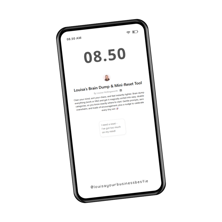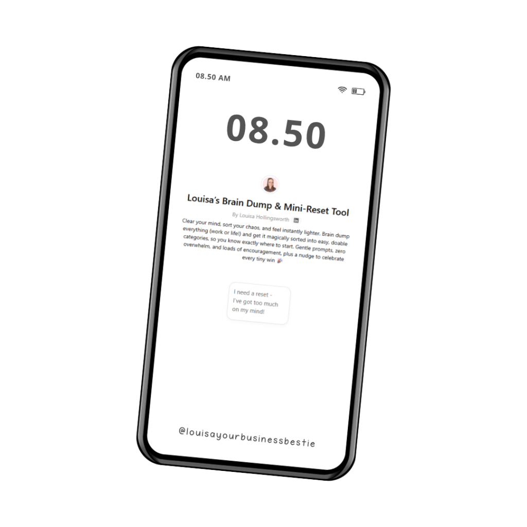 Feeling overwhelmed, stuck, or not sure where to start? My Brain Dump Mini Reset Tool helps you declutter your mind, organise your thoughts, and find your focus in just a few minutes, even if you’re juggling work, family, and all the tabs open in your brain.